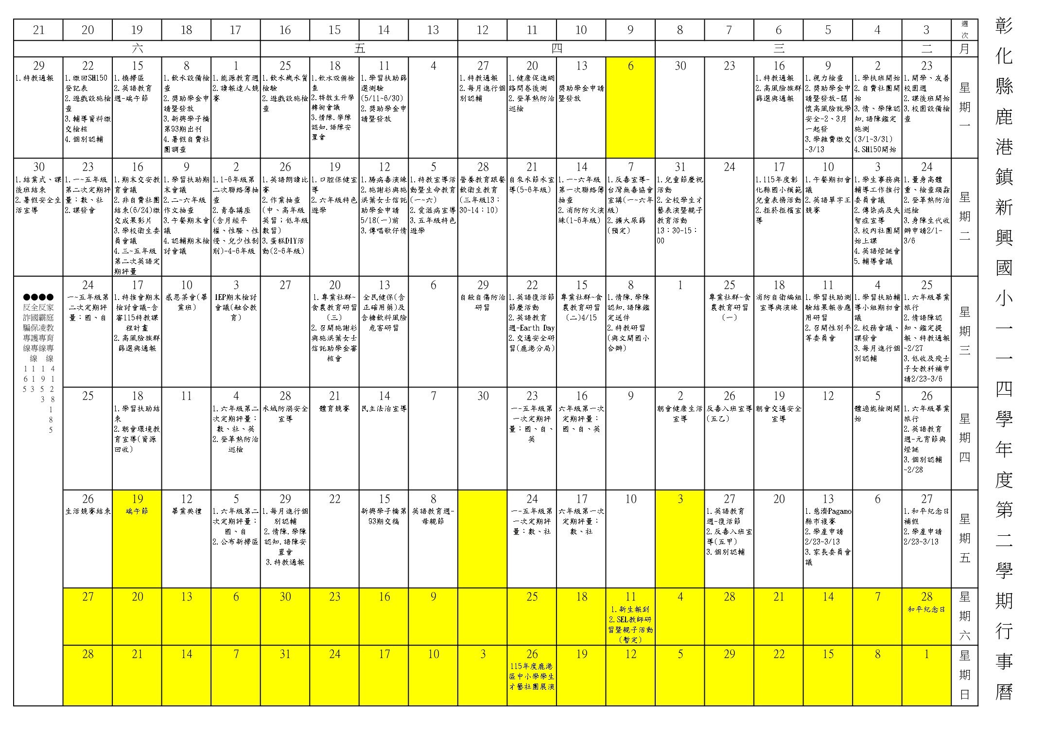 學年度第二學期新興國小行事曆