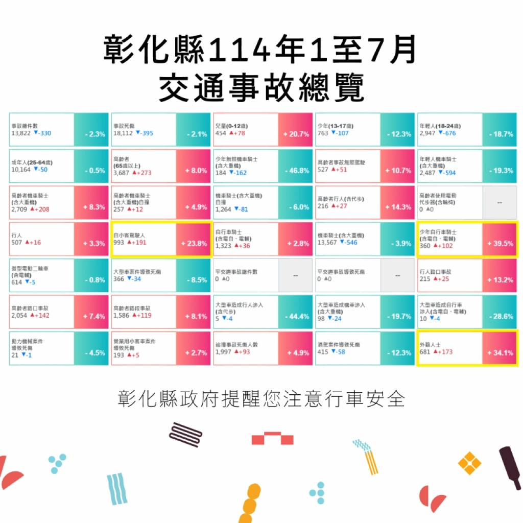 轉知本縣114年1-7月道路交通事故死傷累計18,112人,請大眾共同宣交通安全觀念!